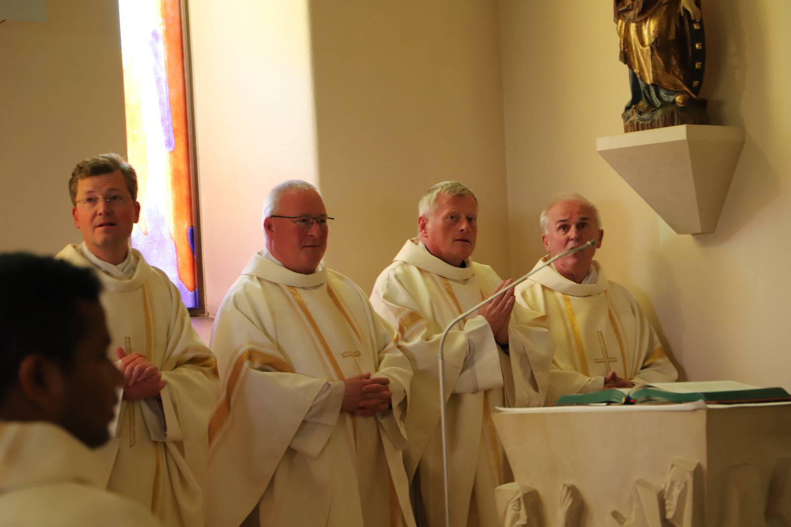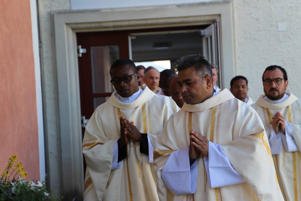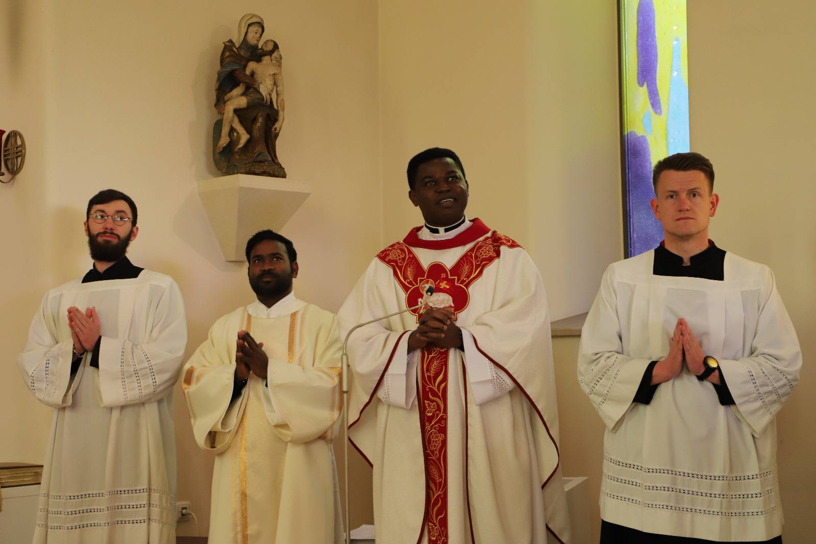 Die regelmäßigen Besucher oder Zuschauer bei unserer Montagsmesse werden wohl ein wenig überrascht gewesen sein, als Fr. Ndudi aus Nigeria zu afrikanischen Klängen in die Katharinenkapelle unseres Priesterseminars einzog. Mit viel Gefühl und noch mehr Rhythmus im Blut haben unsere nigerianischen Priester, Diakone und Seminaristen die heilige Messe afrikanisch gestaltet und begleitet. In seiner Predigt, die zugleich ein großartiges Lebenszeugnis war, erinnerte uns Fr. Ndudi an die »Einsamkeit Jesu«, der im Tabernakel auf uns wartet. Mit dem selbst angestimmten Lied »I surrender« schloss Fr. Ndudi dann die Predigt ab.