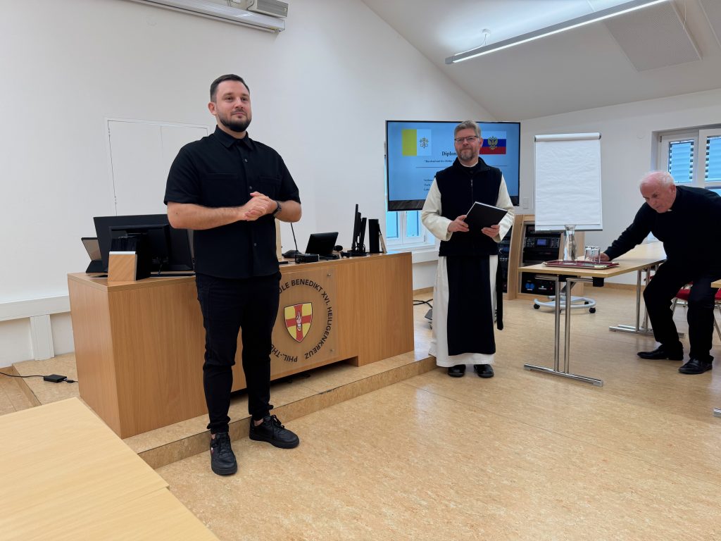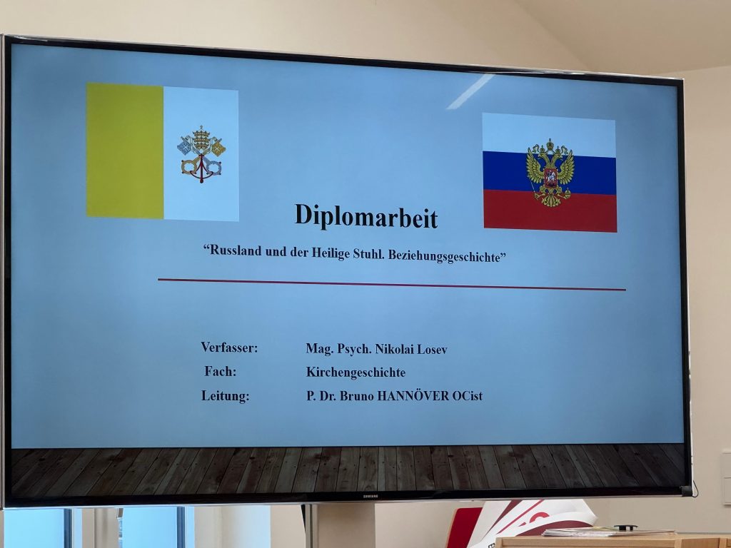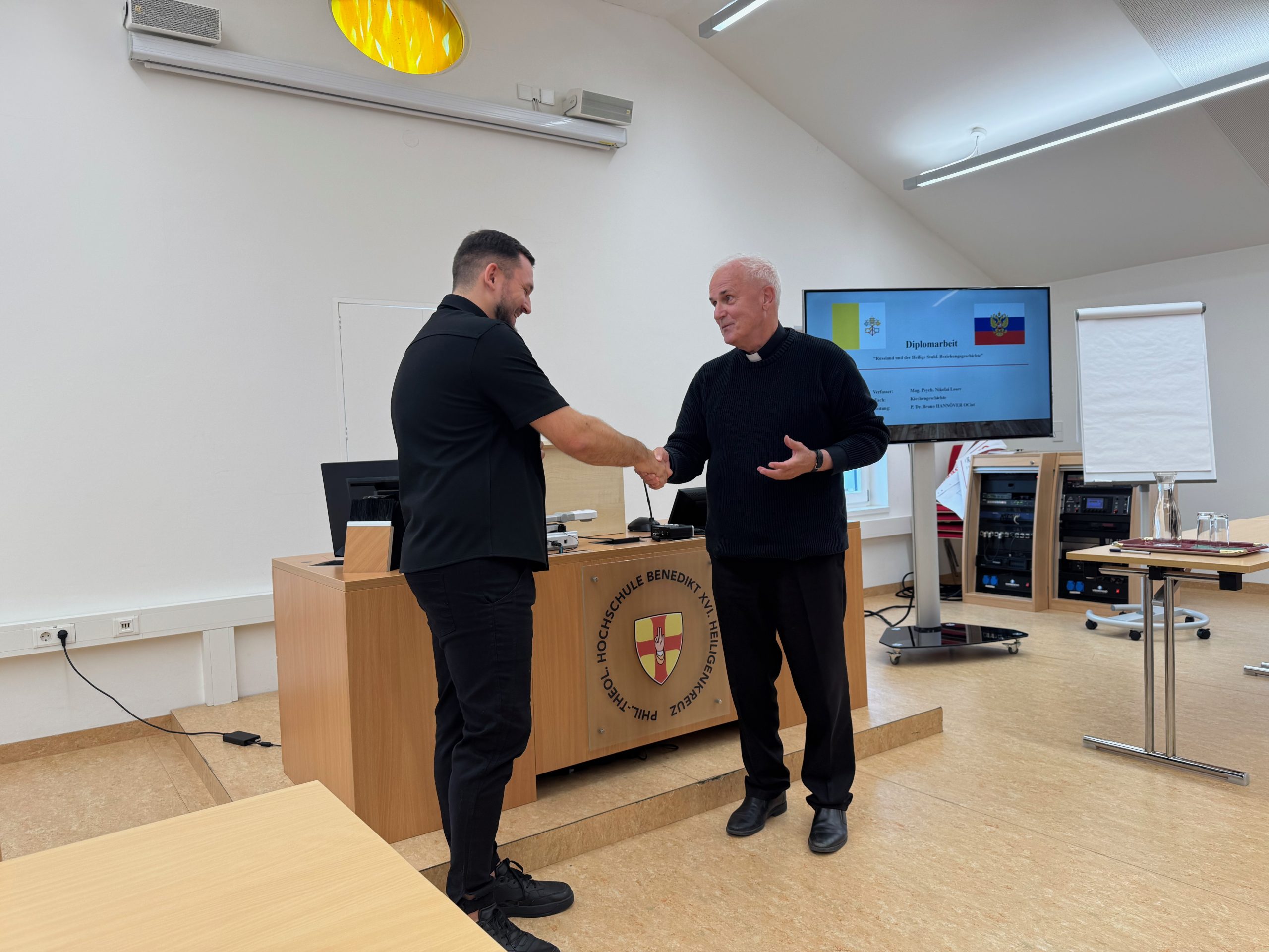 Mit einer ausgezeichneten Arbeit über die Beziehungen zwischen dem Heiligen Stuhl und Russland hat unser Seminarist Nikolai, gebürtiger Moskauer, der aber Priesteramtskandidat im Bistum Eichstätt ist, sein Studium an unserer Hochschule abgeschlossen. Rektor Klausnitzer gratulierte ihm zur Arbeit und zur heutigen Vorstellung.