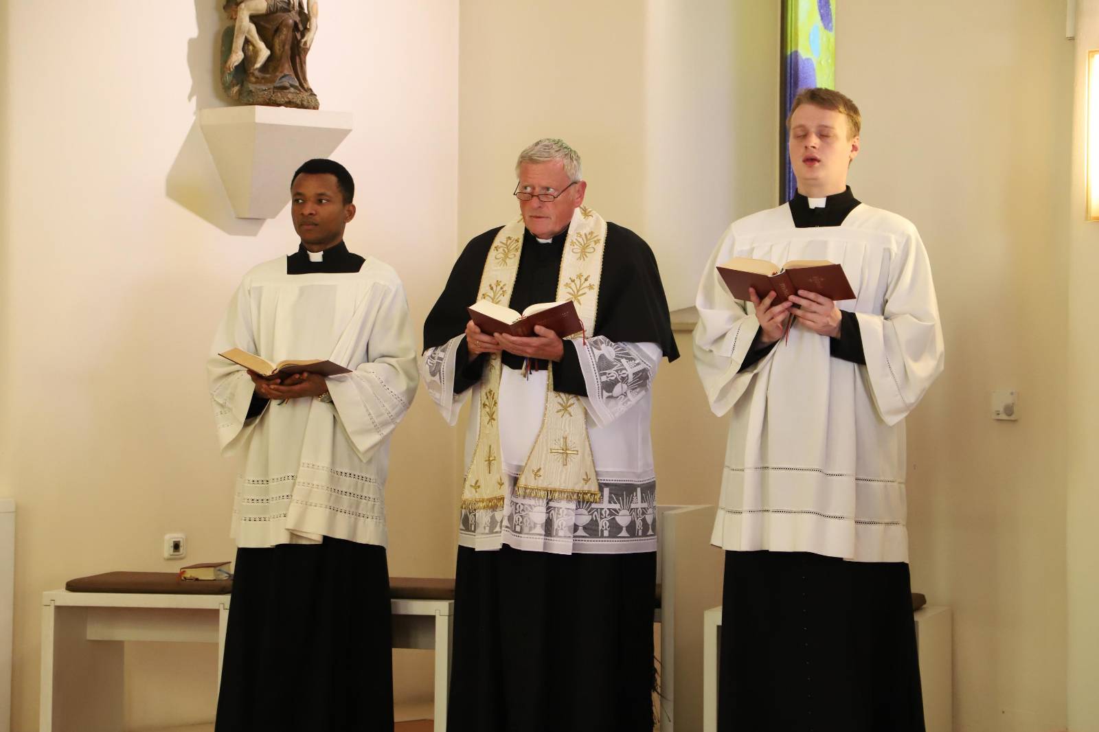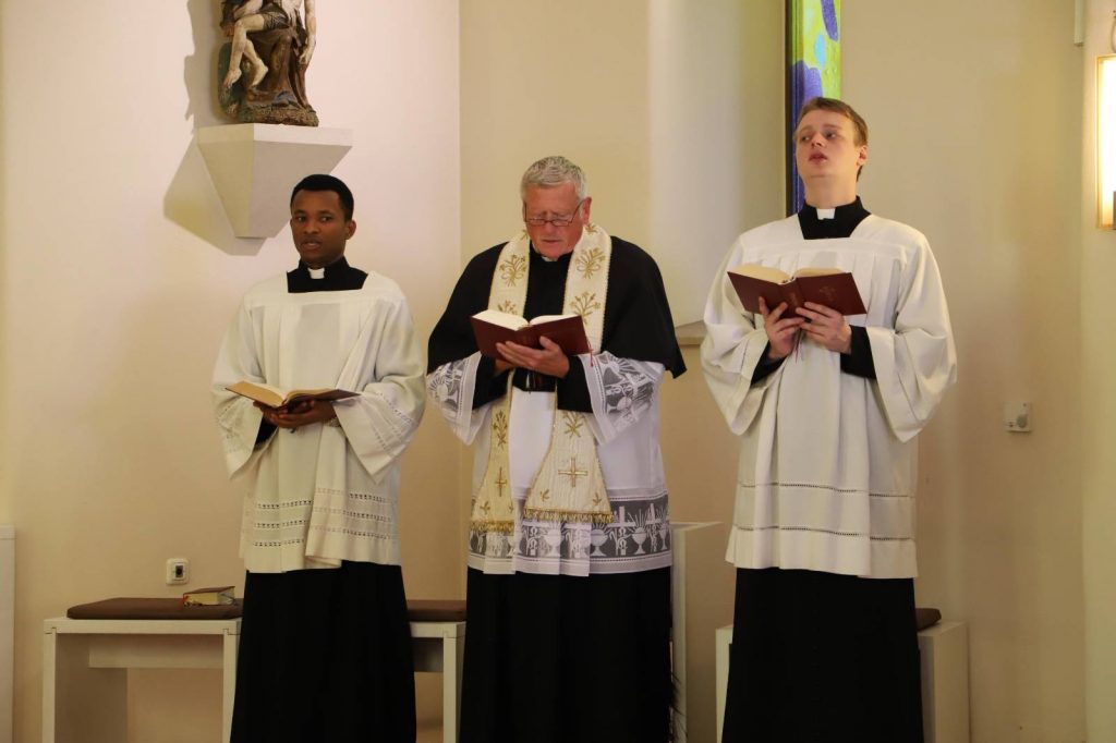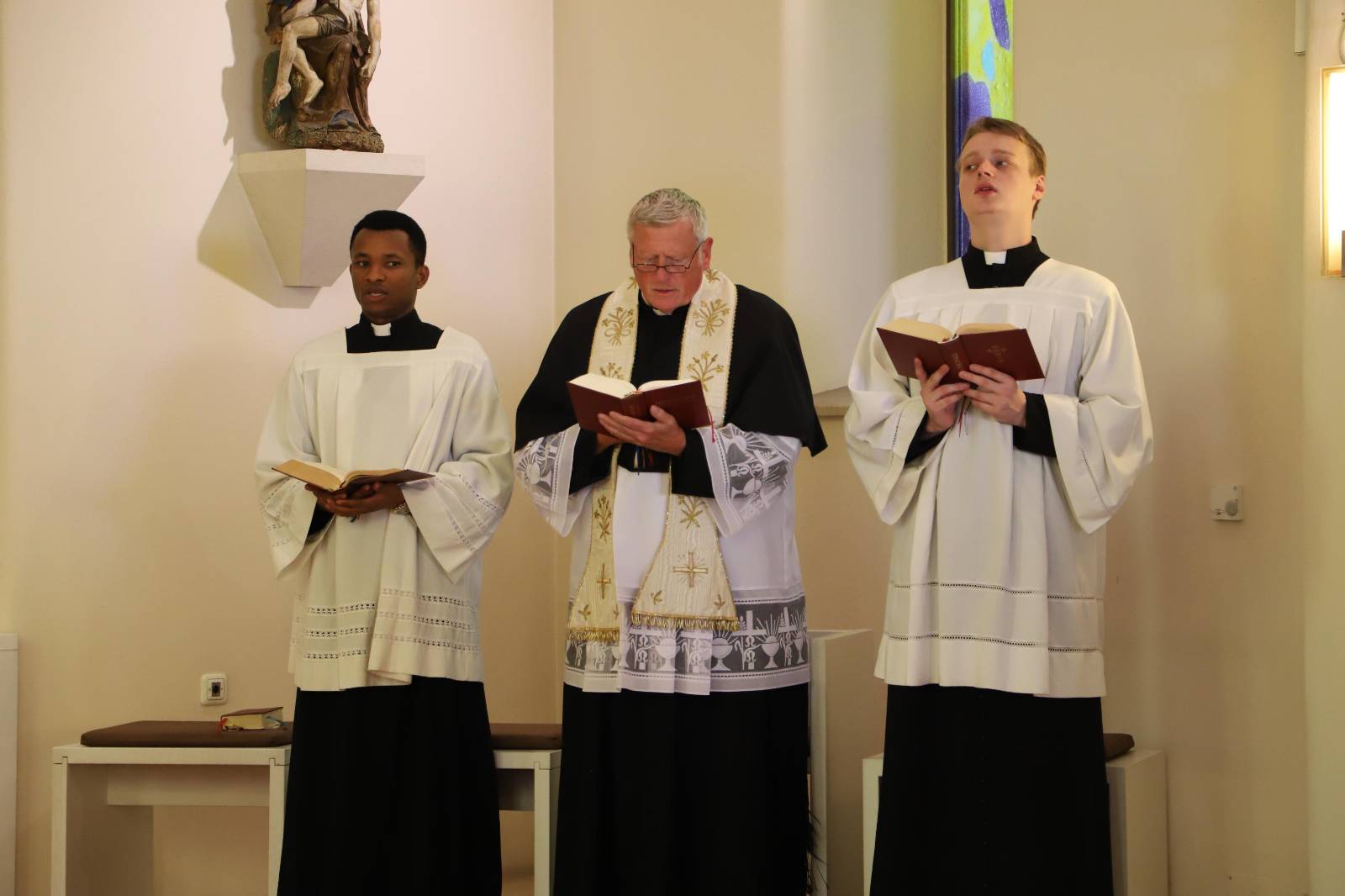 Einmal monatlich begehen wir im Leopoldinum ein sogenanntes »Hauswochenende«. Mit der Vesper und dem gemeinsamen Abendessen am Freitag beginnend, verbringen wir das Hauswochenende bis zum Mittagessen am Sonntag gemeinsam, mit heiligen Messen am Samstag und Sonntag, mit gemeinsamem Studengebet und gemeinsamen Mahlzeiten. Ein Höhepunkt ist dabei die feierliche Vesper am Samstagabend, die wir aus dem deutschen Antiphonale singen. Dr. Schmidt, der uns auch in der Stimmbildung sehr unterstützt, begleitet die Schola und die Seminargemeinschaft dabei an der Orgel.