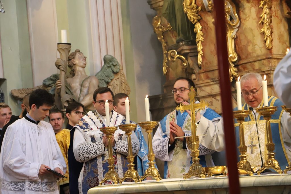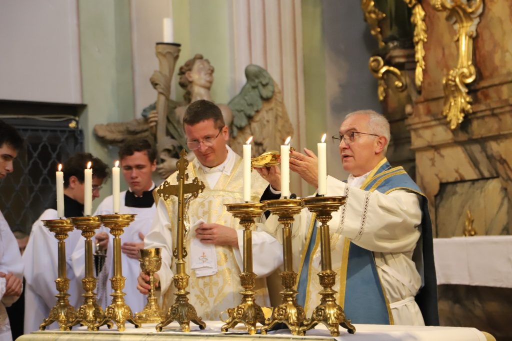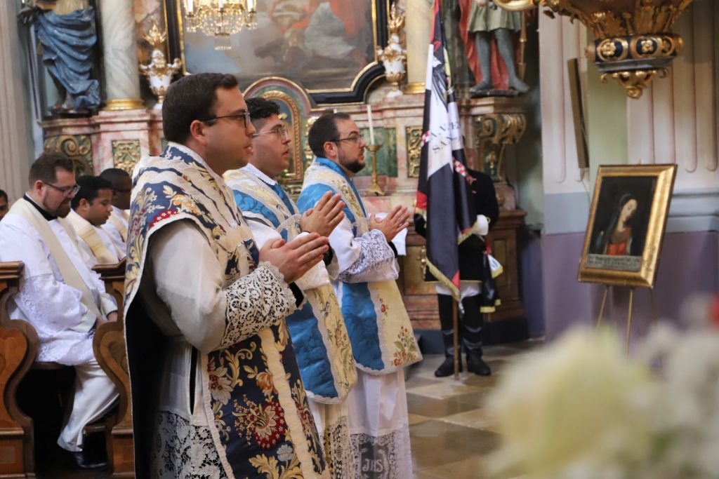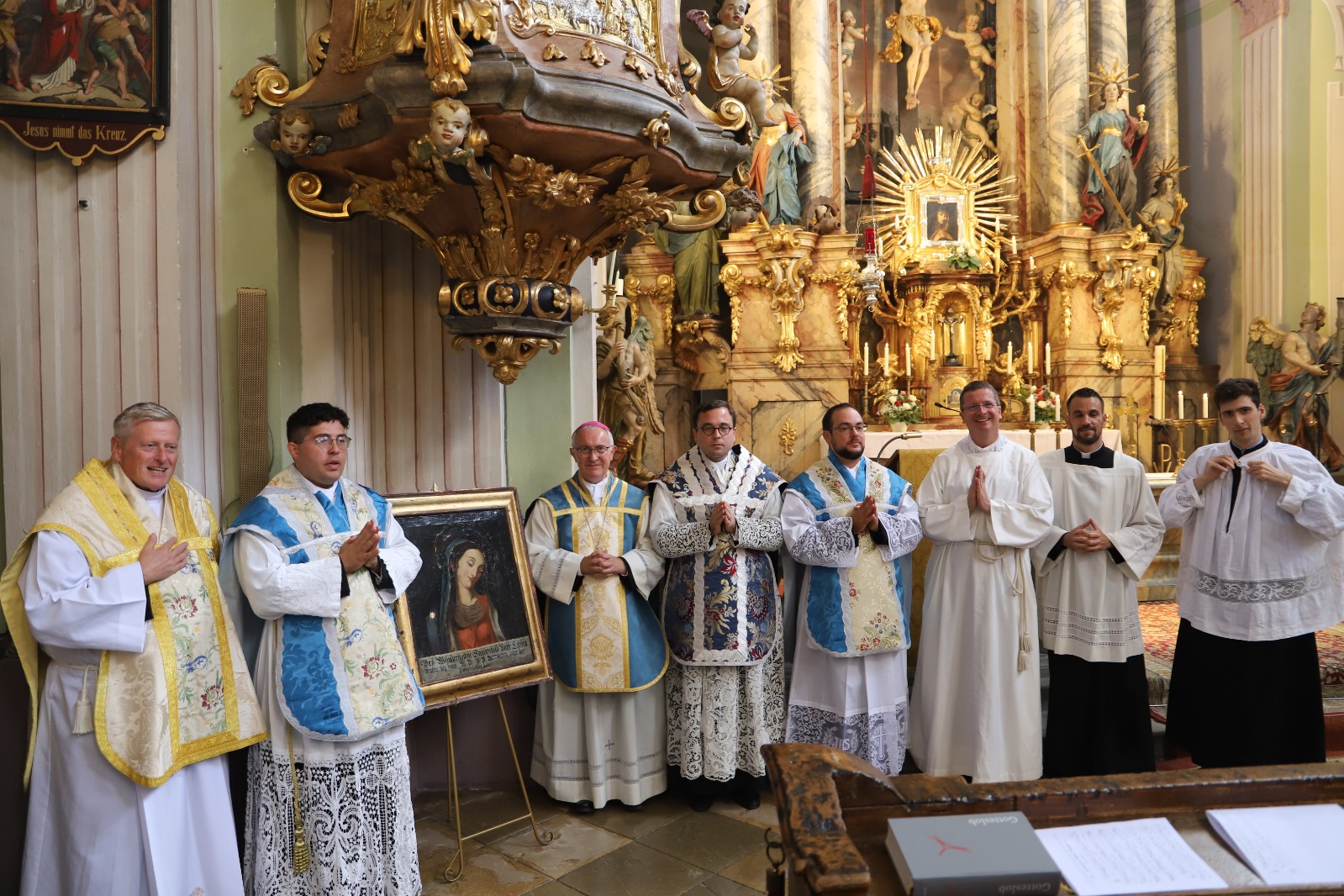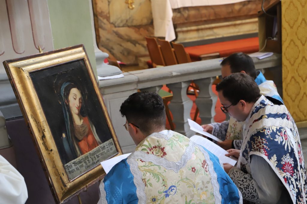 Weihbischof Anton Leichtfried, der alle drei vor etwa einem Jahr zu Diakonen weihte, zelebrierte das Pontifikalamt und spendete die Priesterweihe. Am Ende der Feier vertrauten sich die drei Neupriester in einer ergreifenden Weiheformel vor dem Gnadenbild innig der allerseligsten Jungfrau Maria an.