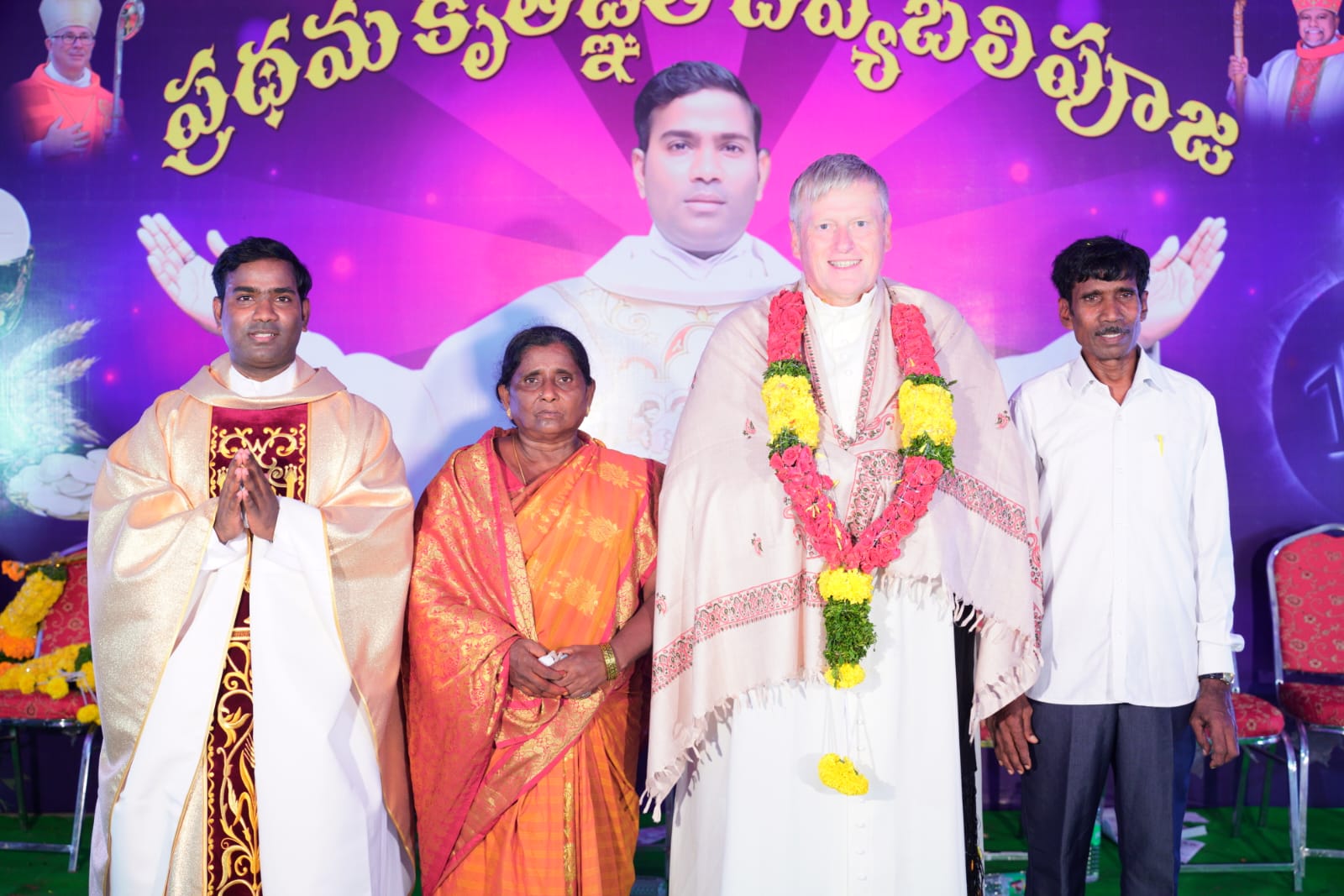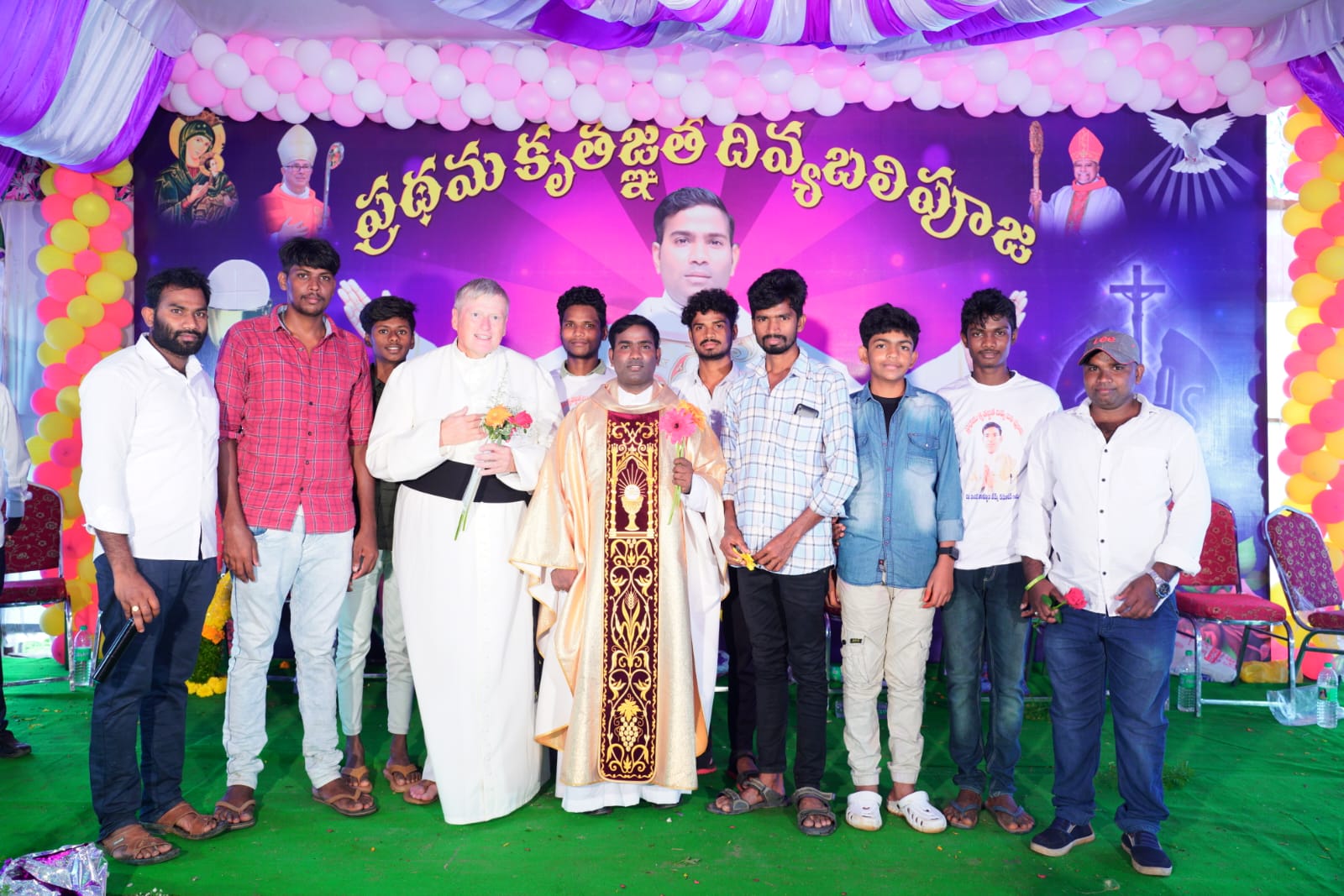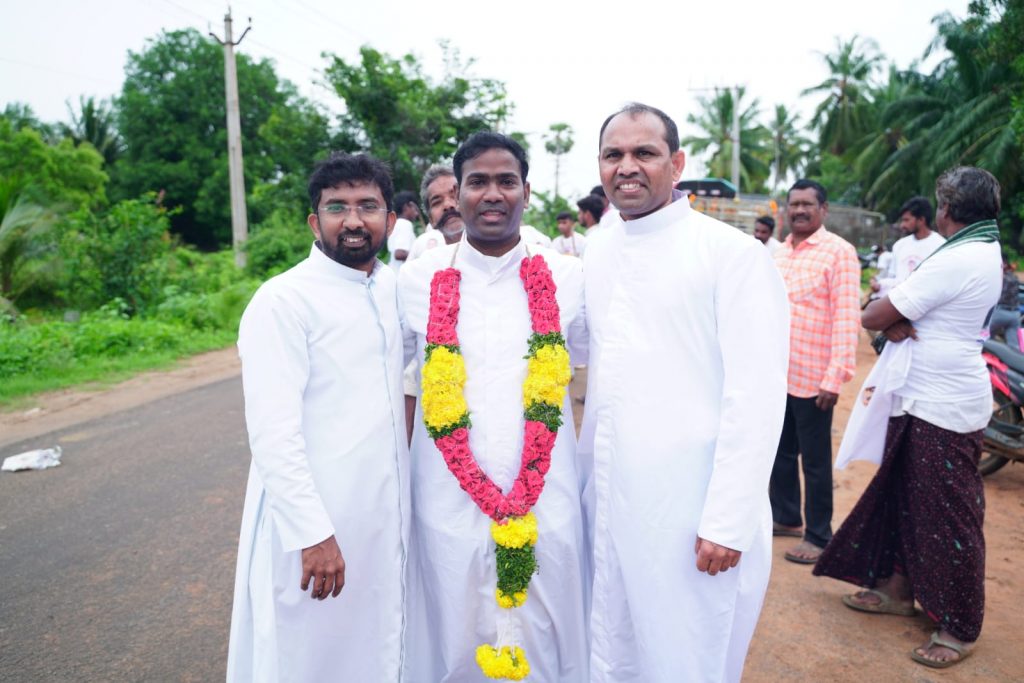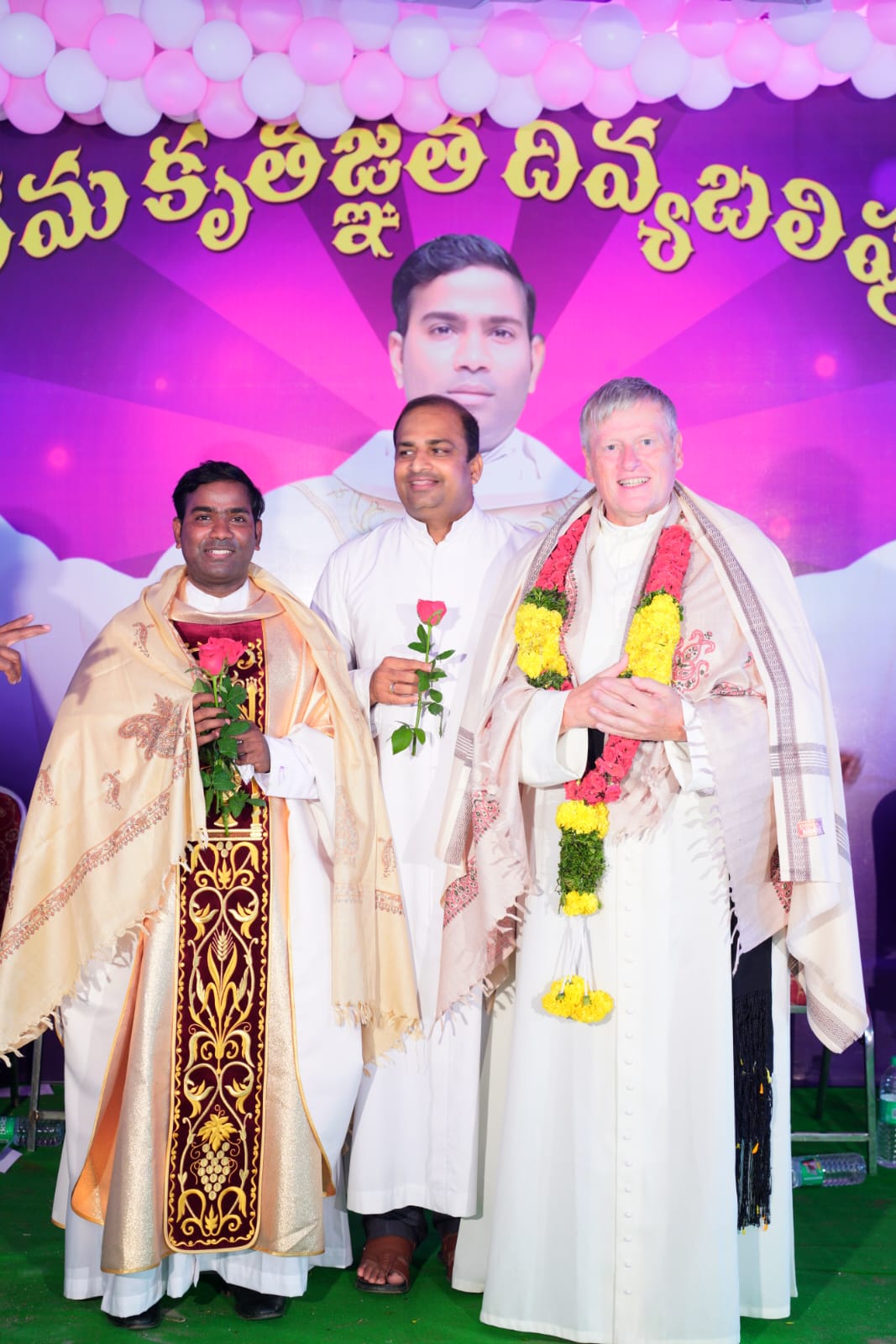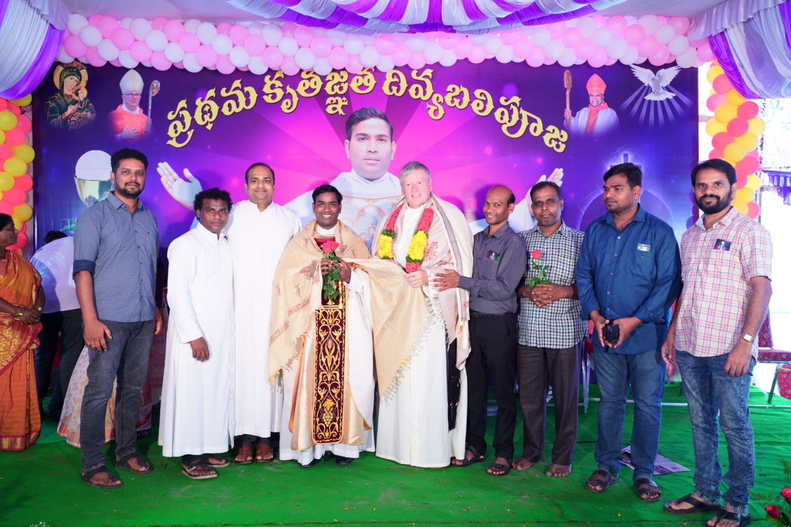 Unser ehemaliger Seminarist und nunmehriger Diözesanpriester der Erzdiözese Salzburg, James Karunakar Talluri, stammt aus dem kleinen Dorf Bhogolu in Andhra Pradesh in Südostindien. Am 24. Juli feierte er mit über 2000 Gästen dort seine Heimatprimiz. Das ganze Dorf beteiligte sich tatkräftig an der Vorbereitung und Durchführung dieser wunderschönen Feier. Unser Direktor Martin Leitner konnte persönlich dabei sein. James wurde auf der Zufahrtsstraße empfangen. Gemeinsam mit Fr. Yohanu Katru (der aus derselben Pfarre Holy Family stammt) und Direktor Leitner bestieg er einen offenen Wagen, um unter Trommelklängen der Dorfjugend und festlicher Musik, unter dem Klang tausender Knallkörper und Raketen und unter einem nicht enden wollenden Blumenregen zum Festplatz zu fahren.