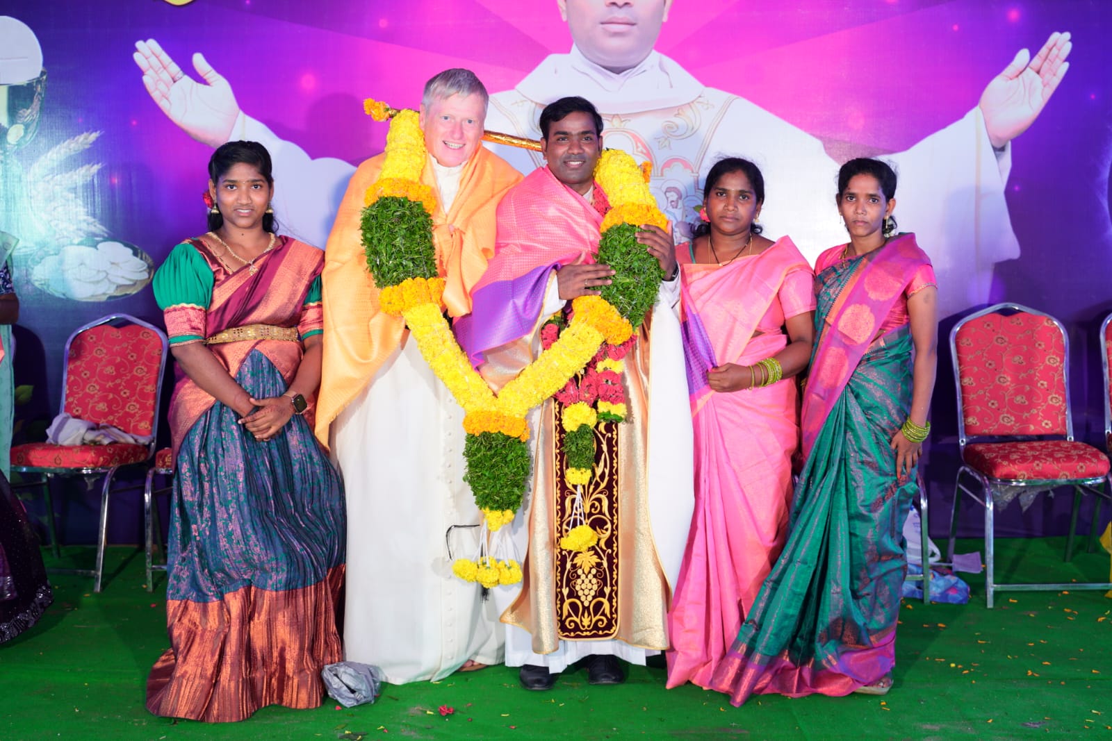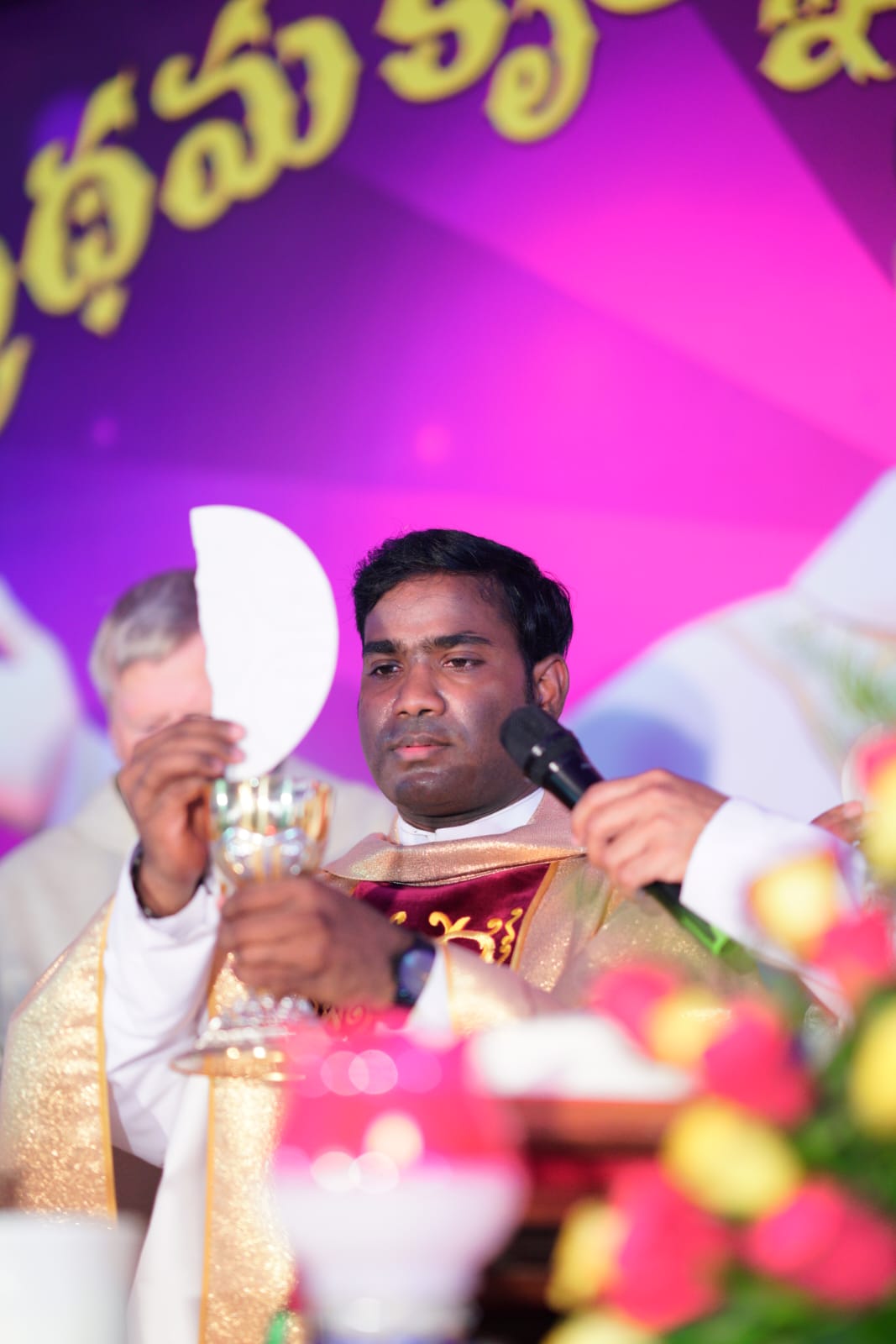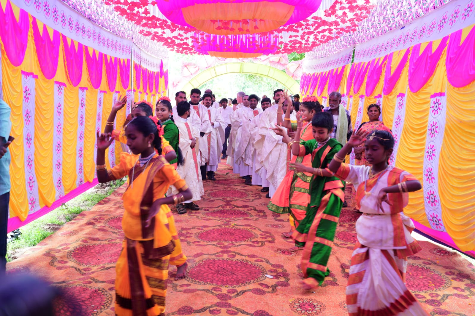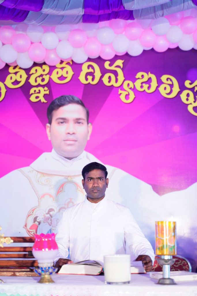 Unser ehemaliger Seminarist und nunmehriger Diözesanpriester der Erzdiözese Salzburg, James Karunakar Talluri, stammt aus dem kleinen Dorf Bhogolu in Andhra Pradesh in Südostindien. Am 24. Juli feierte er mit über 2000 Gästen dort seine Heimatprimiz. Das ganze Dorf beteiligte sich tatkräftig an der Vorbereitung und Durchführung dieser wunderschönen Feier. Unser Direktor Martin Leitner konnte persönlich dabei sein. James wurde auf der Zufahrtsstraße empfangen. Gemeinsam mit Fr. Yohanu Katru (der aus derselben Pfarre Holy Family stammt) und Direktor Leitner bestieg er einen offenen Wagen, um unter Trommelklängen der Dorfjugend und festlicher Musik, unter dem Klang tausender Knallkörper und Raketen und unter einem nicht enden wollenden Blumenregen zum Festplatz zu fahren.