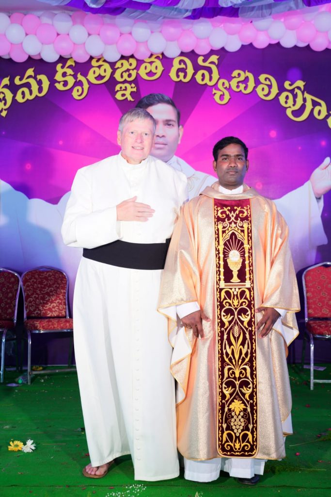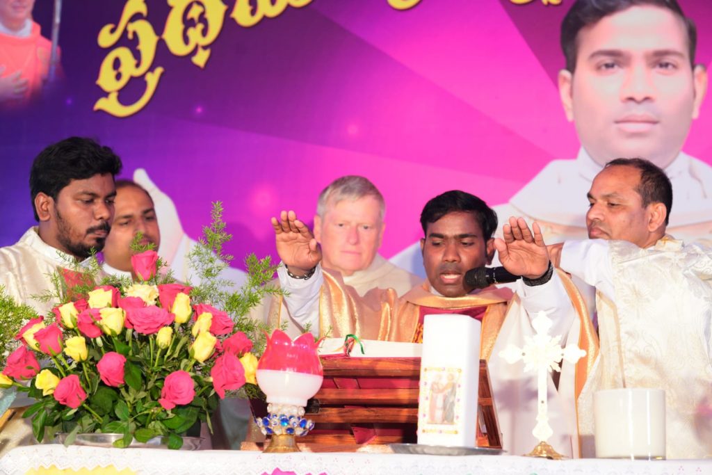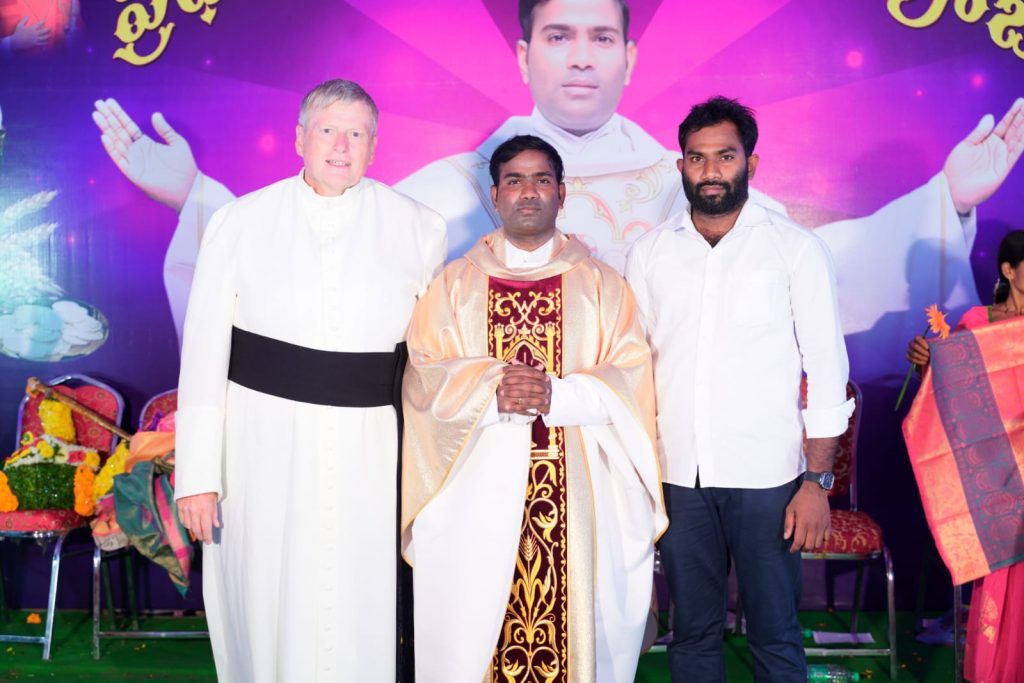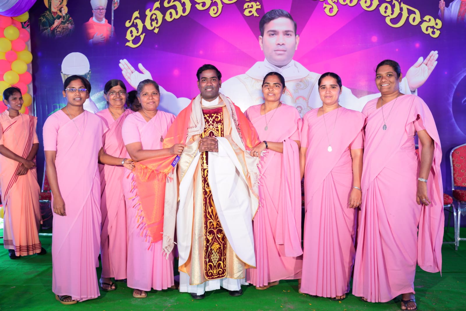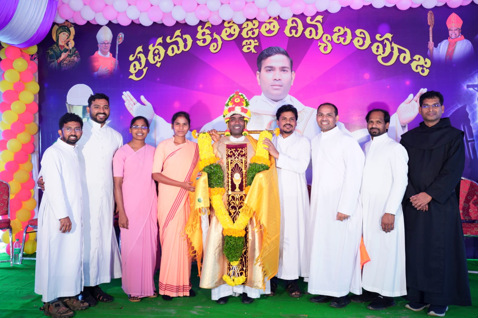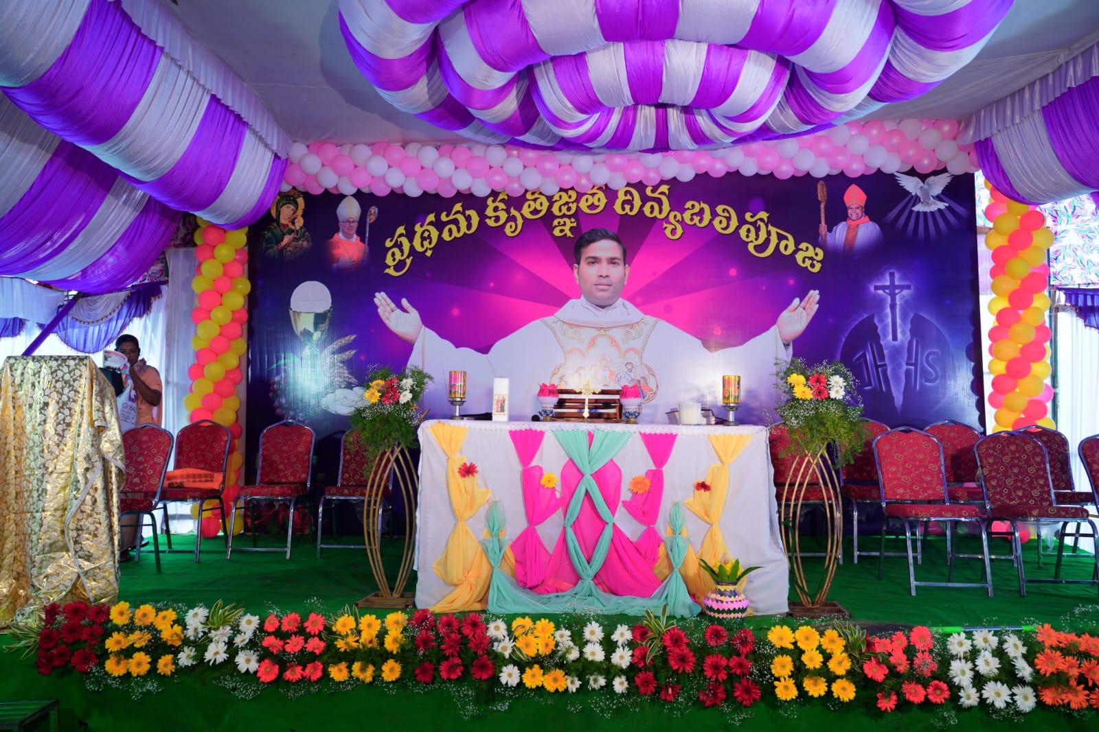 Unser ehemaliger Seminarist und nunmehriger Diözesanpriester der Erzdiözese Salzburg, James Karunakar Talluri, stammt aus dem kleinen Dorf Bhogolu in Andhra Pradesh in Südostindien. Am 24. Juli feierte er mit über 2000 Gästen dort seine Heimatprimiz. Das ganze Dorf beteiligte sich tatkräftig an der Vorbereitung und Durchführung dieser wunderschönen Feier. Unser Direktor Martin Leitner konnte persönlich dabei sein. James wurde auf der Zufahrtsstraße empfangen. Gemeinsam mit Fr. Yohanu Katru (der aus derselben Pfarre Holy Family stammt) und Direktor Leitner bestieg er einen offenen Wagen, um unter Trommelklängen der Dorfjugend und festlicher Musik, unter dem Klang tausender Knallkörper und Raketen und unter einem nicht enden wollenden Blumenregen zum Festplatz zu fahren.