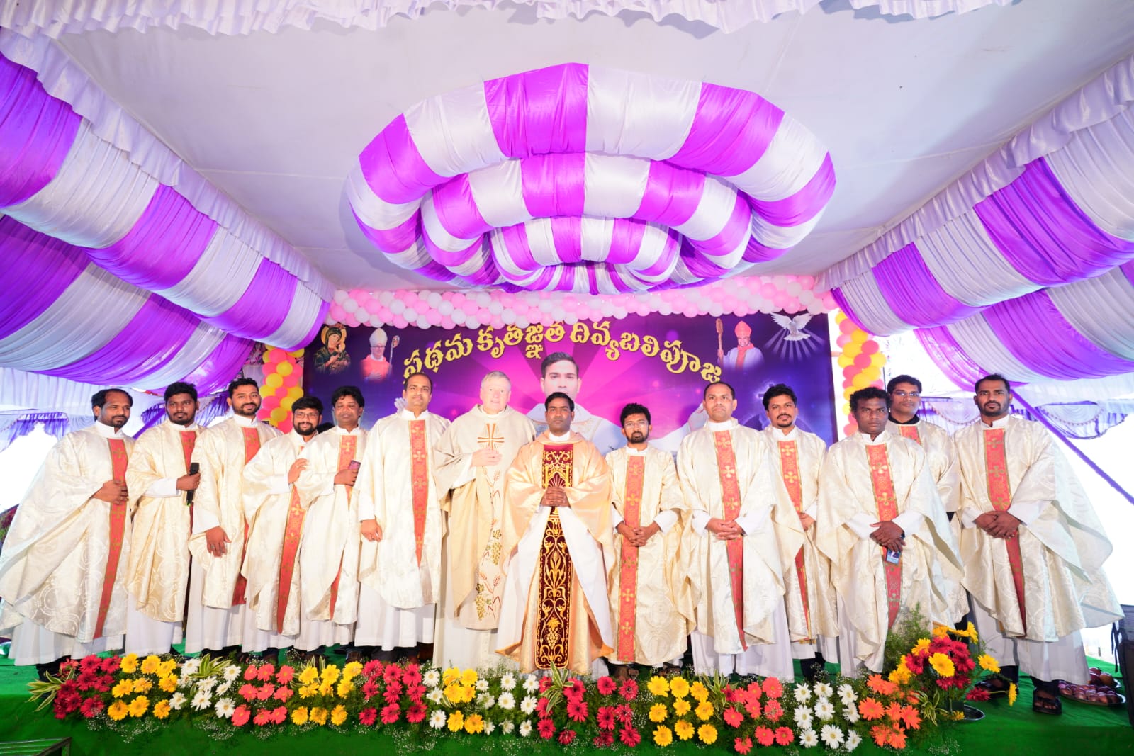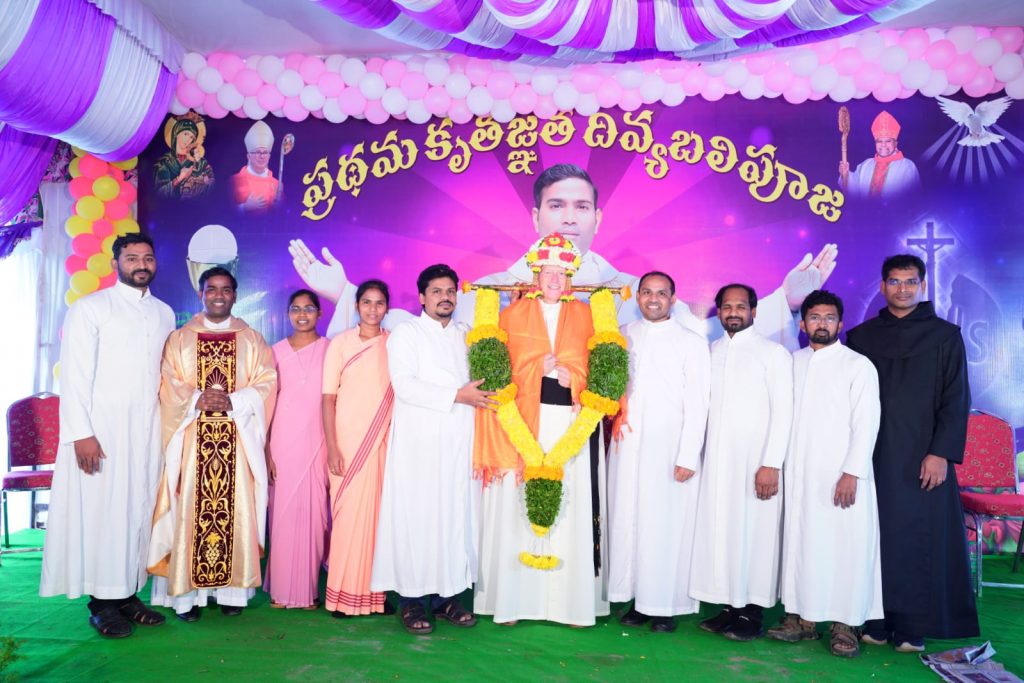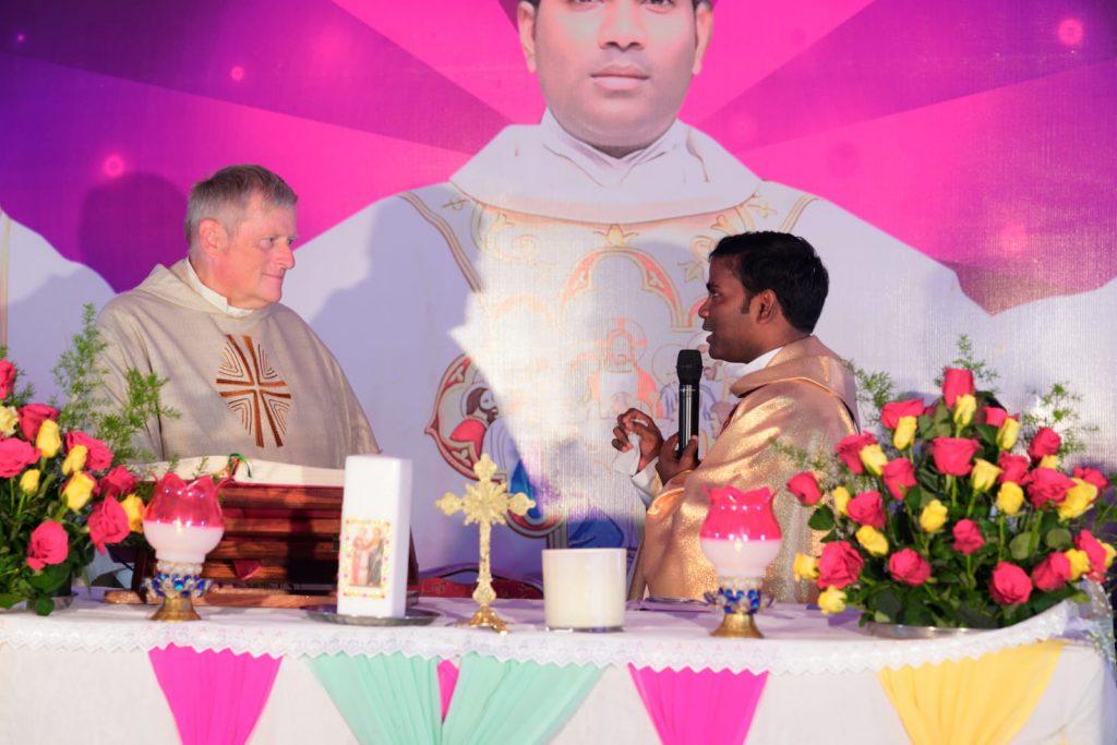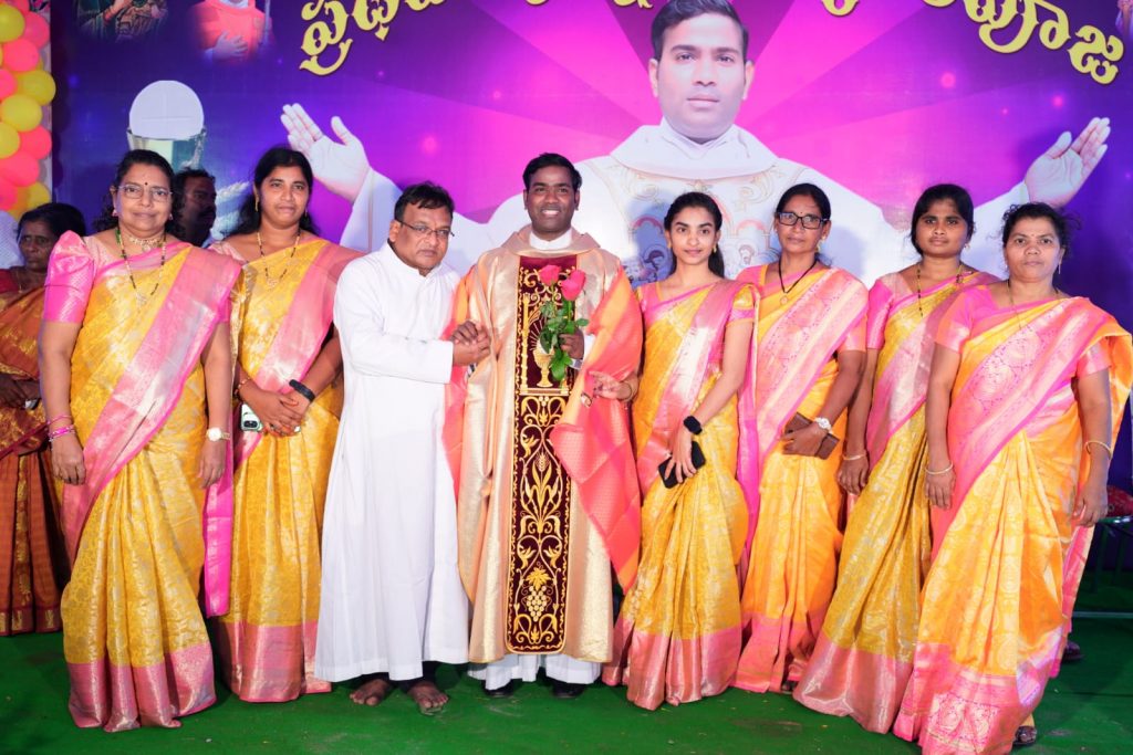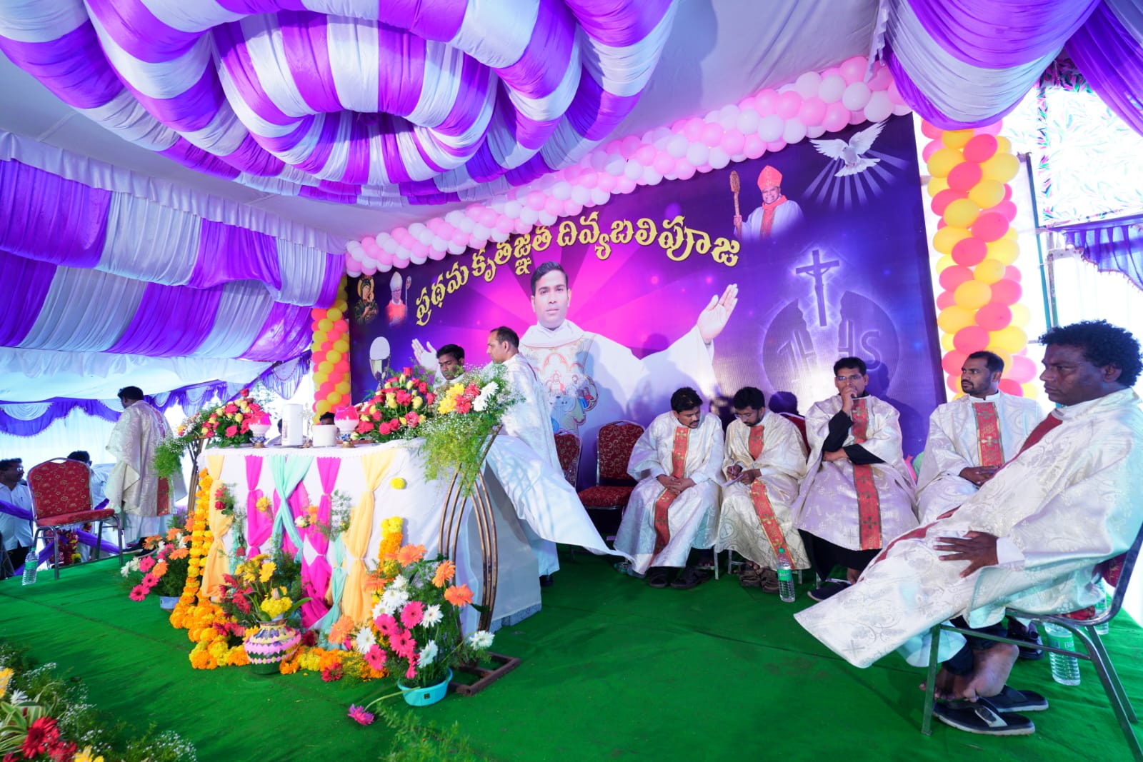 Unser ehemaliger Seminarist und nunmehriger Diözesanpriester der Erzdiözese Salzburg, James Karunakar Talluri, stammt aus dem kleinen Dorf Bhogolu in Andhra Pradesh in Südostindien. Am 24. Juli feierte er mit über 2000 Gästen dort seine Heimatprimiz. Das ganze Dorf beteiligte sich tatkräftig an der Vorbereitung und Durchführung dieser wunderschönen Feier. Unser Direktor Martin Leitner konnte persönlich dabei sein. James wurde auf der Zufahrtsstraße empfangen. Gemeinsam mit Fr. Yohanu Katru (der aus derselben Pfarre Holy Family stammt) und Direktor Leitner bestieg er einen offenen Wagen, um unter Trommelklängen der Dorfjugend und festlicher Musik, unter dem Klang tausender Knallkörper und Raketen und unter einem nicht enden wollenden Blumenregen zum Festplatz zu fahren.
