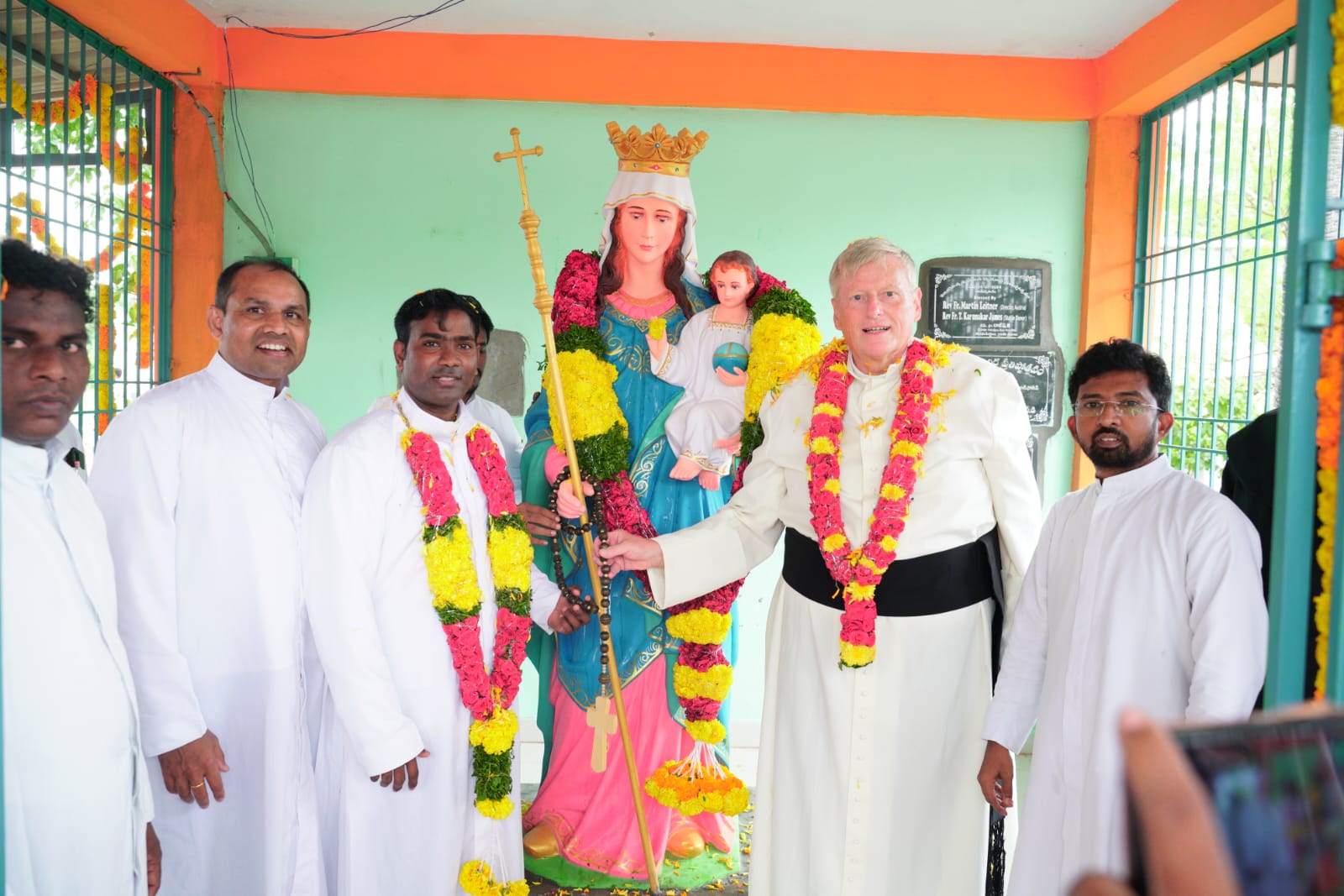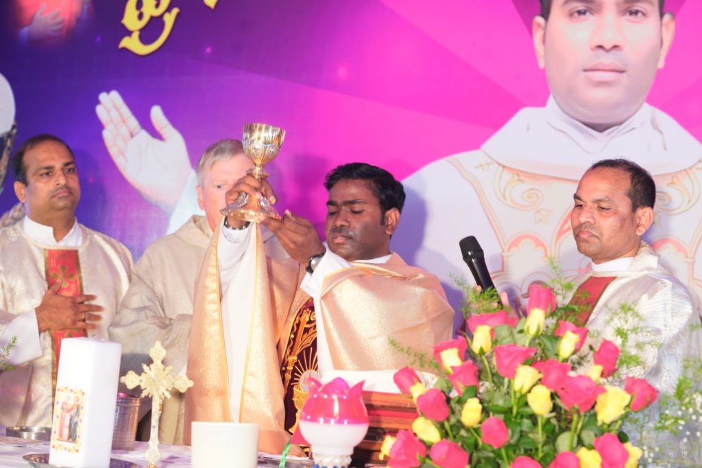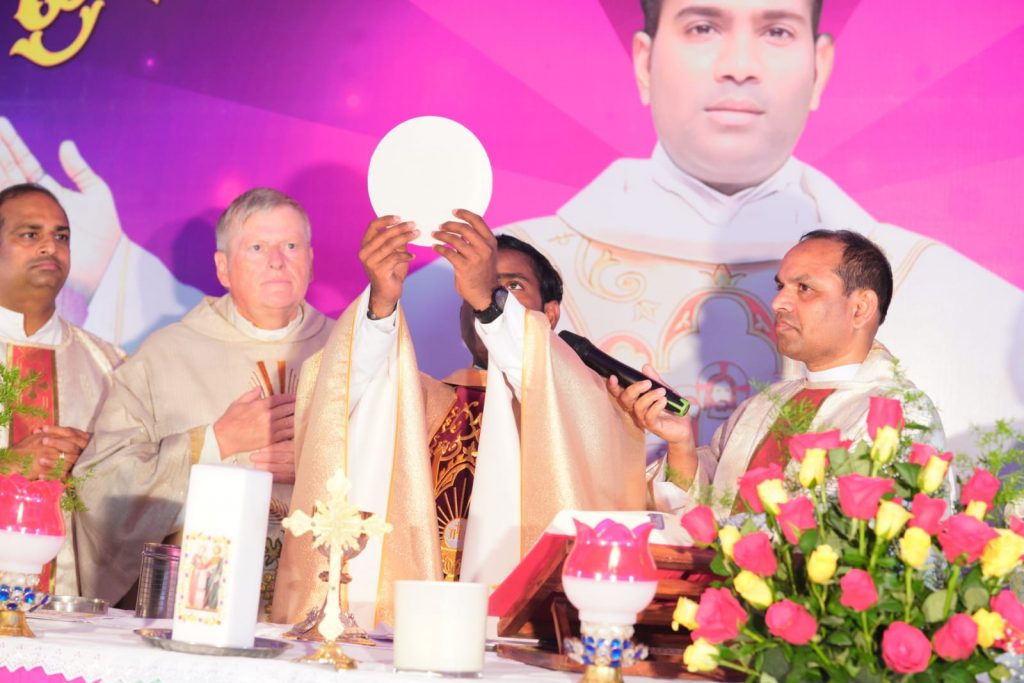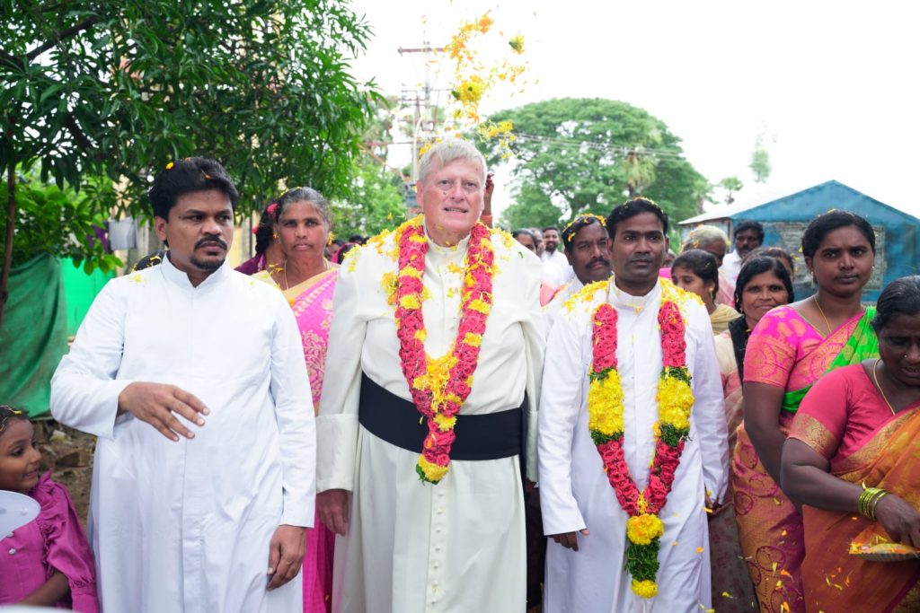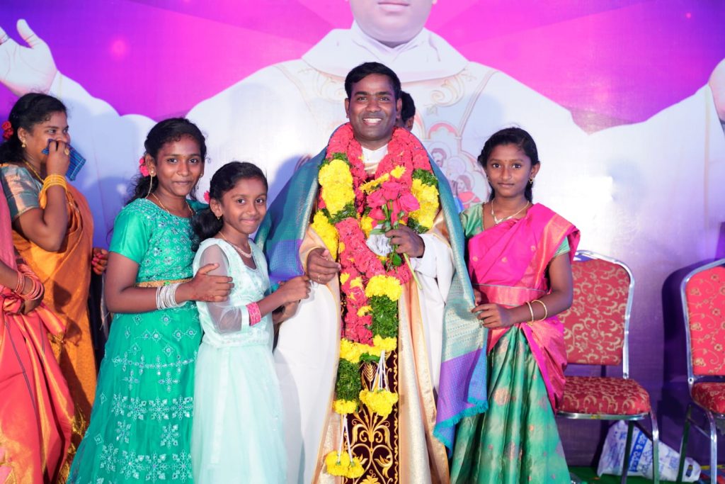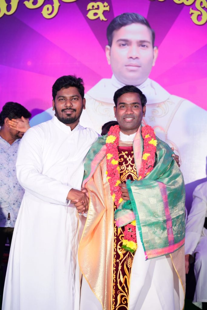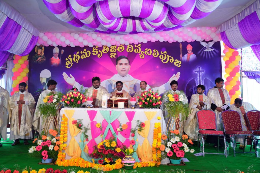 Unser ehemaliger Seminarist und nunmehriger Diözesanpriester der Erzdiözese Salzburg, James Karunakar Talluri, stammt aus dem kleinen Dorf Bhogolu in Andhra Pradesh in Südostindien. Am 24. Juli feierte er mit über 2000 Gästen dort seine Heimatprimiz. Das ganze Dorf beteiligte sich tatkräftig an der Vorbereitung und Durchführung dieser wunderschönen Feier. Unser Direktor Martin Leitner konnte persönlich dabei sein. James wurde auf der Zufahrtsstraße empfangen. Gemeinsam mit Fr. Yohanu Katru (der aus derselben Pfarre Holy Family stammt) und Direktor Leitner bestieg er einen offenen Wagen, um unter Trommelklängen der Dorfjugend und festlicher Musik, unter dem Klang tausender Knallkörper und Raketen und unter einem nicht enden wollenden Blumenregen zum Festplatz zu fahren.