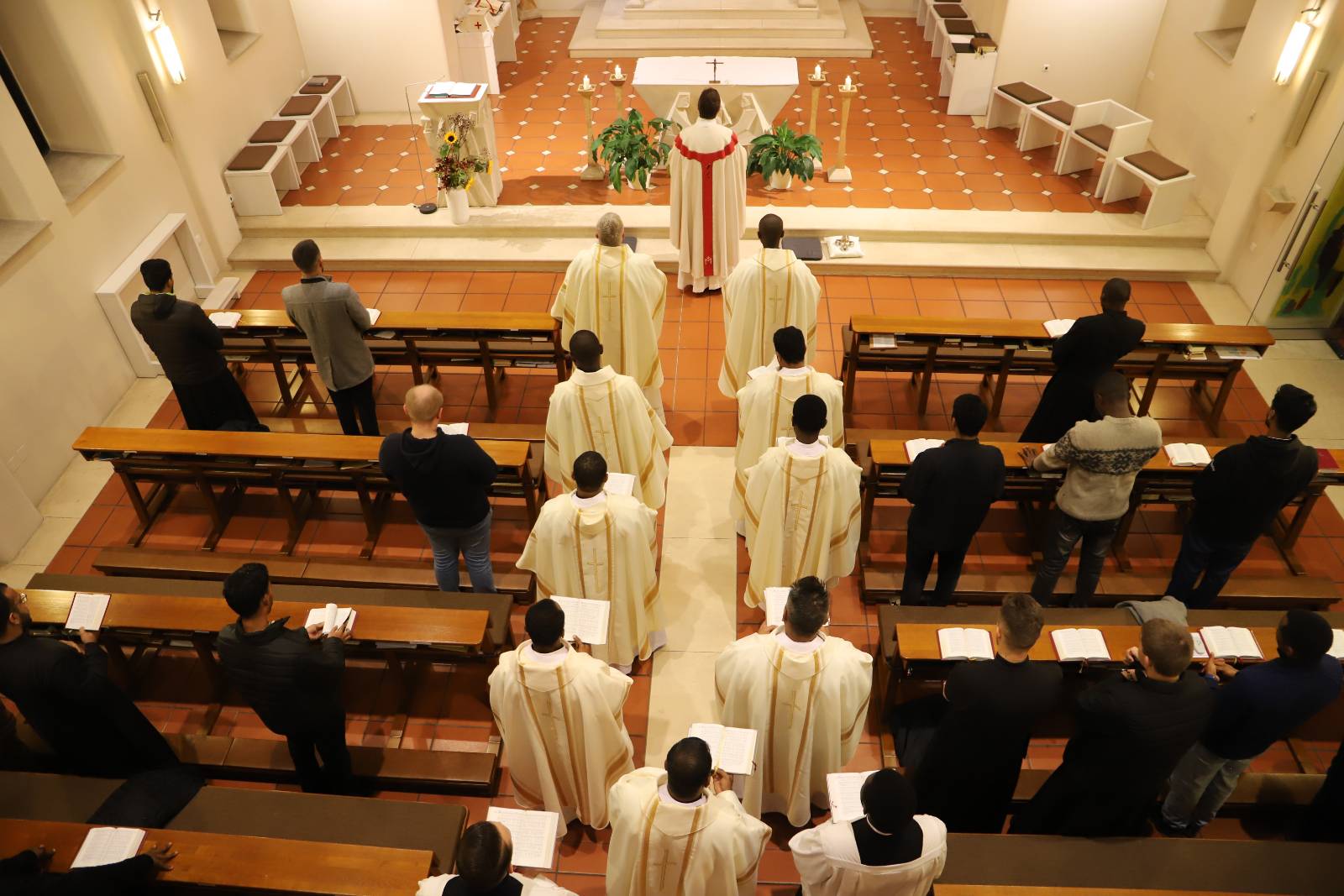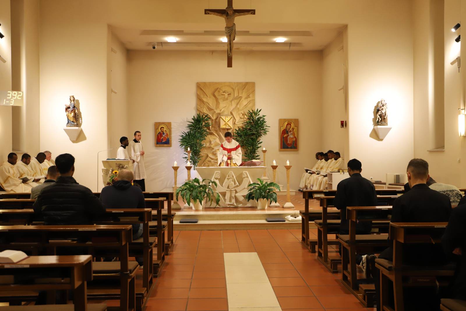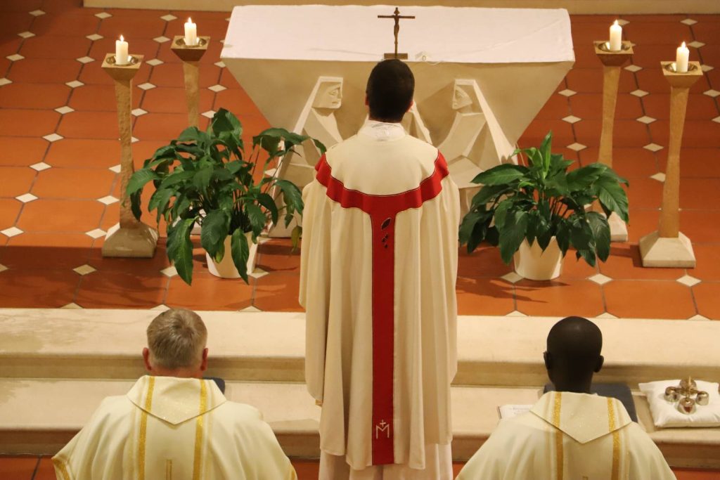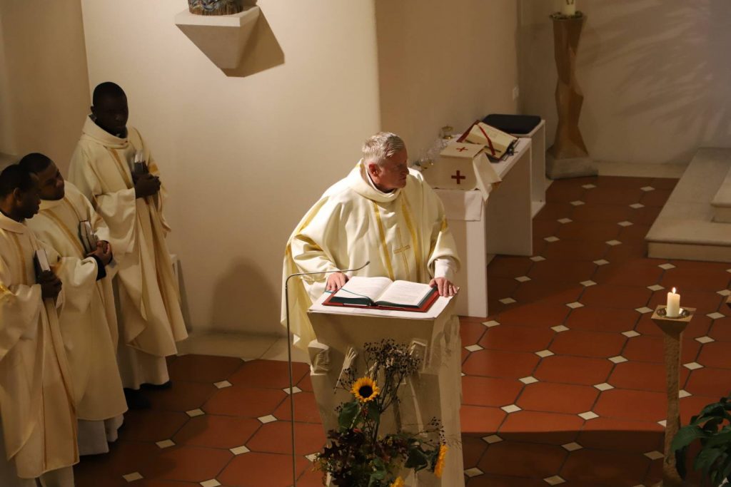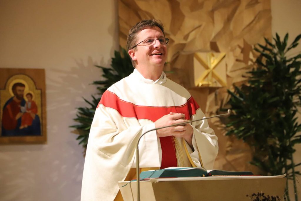 Sein 4. Priesterweihejubiläum beging unser Vizedirektor, P. Laurentius, mit einer festlichen Hl. Messe in unserer Seminarkirche, der Katharinenkapelle. Bei der Predigt erklärte er uns die Symbolik seines Messgewandes, das ein Herz-Jesu-Gewand mit der Assoziation des Bildes des Barmherzigen Jesus der Sr. Faustina ist.