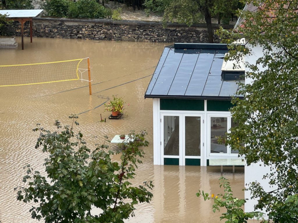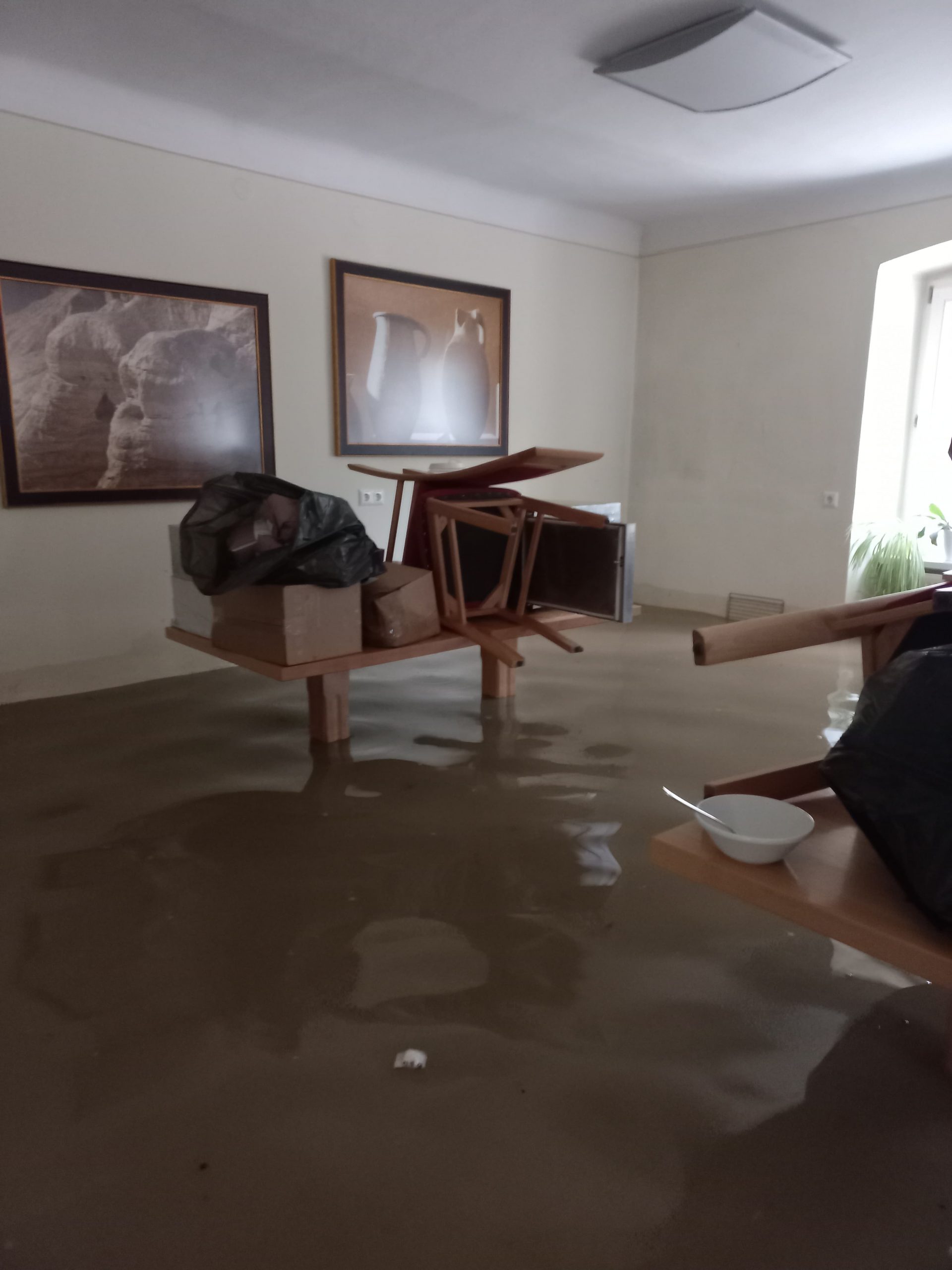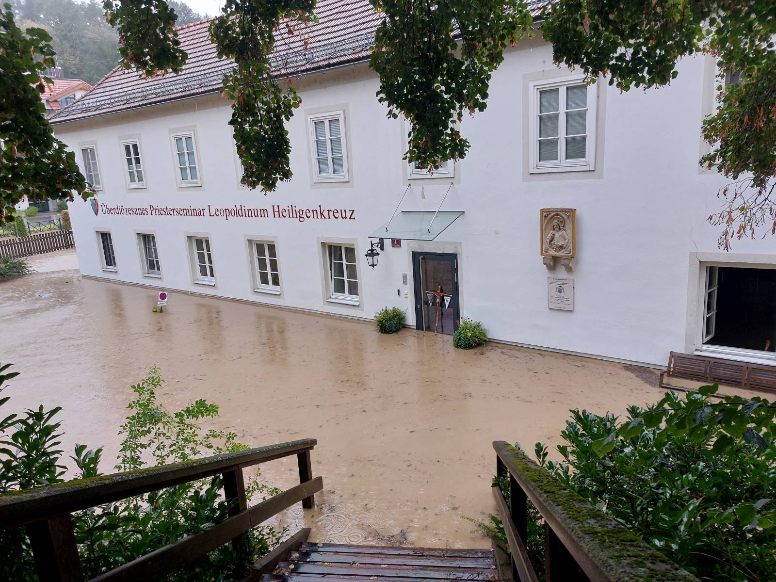 Die Hochwasserkatastrophe hat auch uns nicht verschont. Als Direktor Leitner am frühen Morgen des 15. Septembers aus dem Fenster blickte, musste er mit Erschrecken feststellen, dass der Parkplatz vor dem Hauptgebäude des Leopoldinums bereits einige Zentimeter überflutet war. Das Wasser stieg rasch an, drang über den Speisesaal in das Erdgeschoss des Hauptgebäudes. So wurden neben dem Keller alle Räume etwa 60cm hoch überflutet.