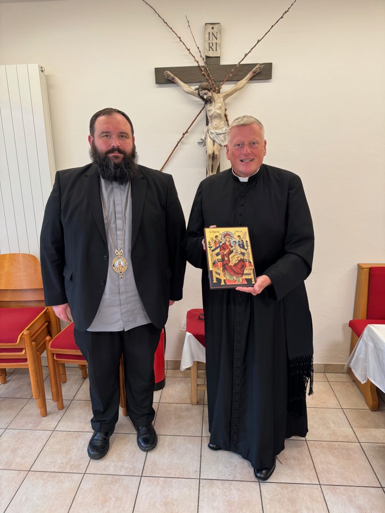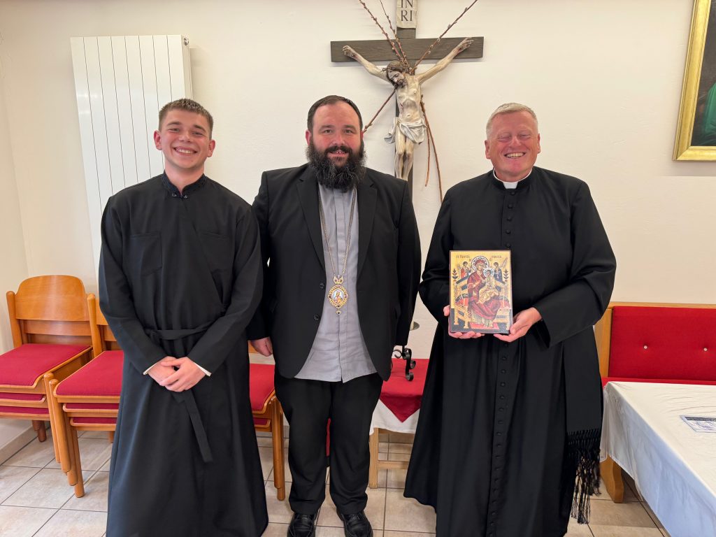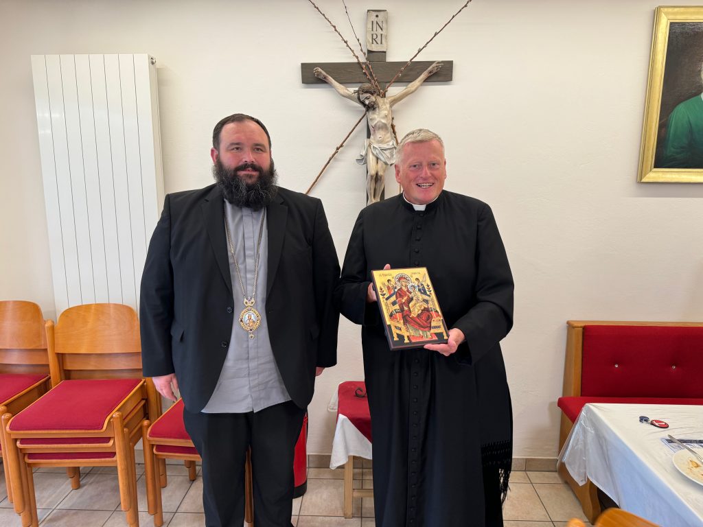 Seit Sommersemester 2024 ist Dmytro Parii aus der Eparchie Sokal Zhovka, Ukraine, Mitglied unserer Seminargemeinschaft. Nun freuten wir uns über den Besuch von Weihbischof Petro Loza. Da er in Innsbruck studierte, spricht er hervorragend Deutsch. Nach dem Abendessen überreichte er Direktor Leitner eine wunderschöne Marien-Ikone, die einen Ehrenplatz in unserer Josefskapelle finden wird.